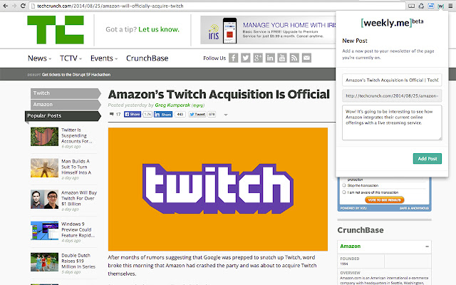 Simply click the extension icon to automatically prepare a new post for your newsletter, including a link & title to the web page you're currently viewing.