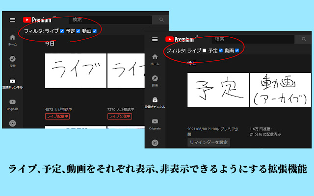 配信予定、プレミア公開、直近の配信のアーカイブへのアクセスし易さが向上します。 バグ報告、要望などありましたら気軽にお声がけください。 Twitter(DM開放): @suraimu752