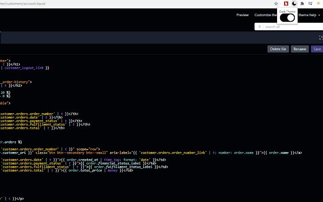 Shopify Code Editor Dark Mode web extension integrated with the OffiDocs Chromium online