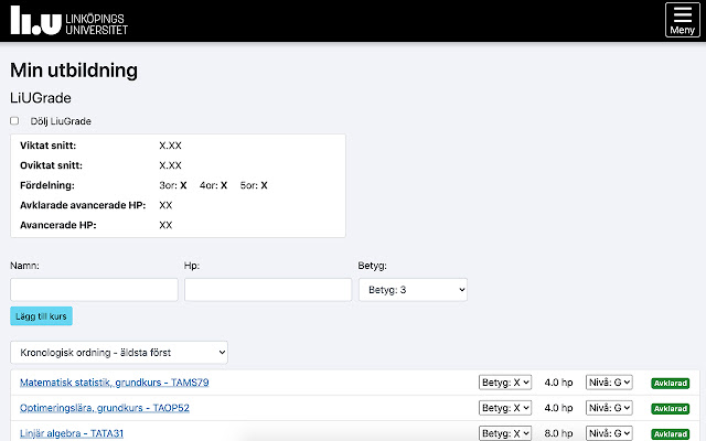 Tillägget lägger till funktionalitet under sidan "Min utbildning" på Ladok som räknar ut ditt betygssnitt och antal avancerade Hp automatiskt.