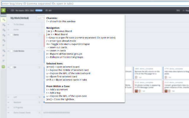 com/dep/charmin/issues/ Adds additional functionality to TargetProcess (TP3) Navigation l = Leap to a specific case m = Toggle side menu expand/collapse - = zoom out cards + = zoom in cards e = Expand all horizontal groups c = Collapse all horizontal groups Selected Item: t = Expose the ID/title of selected card u = Expose the URL of the selected card From Within a Case: c = Add a comment t = Add a tag u = Expose the URL of the open case https://github.