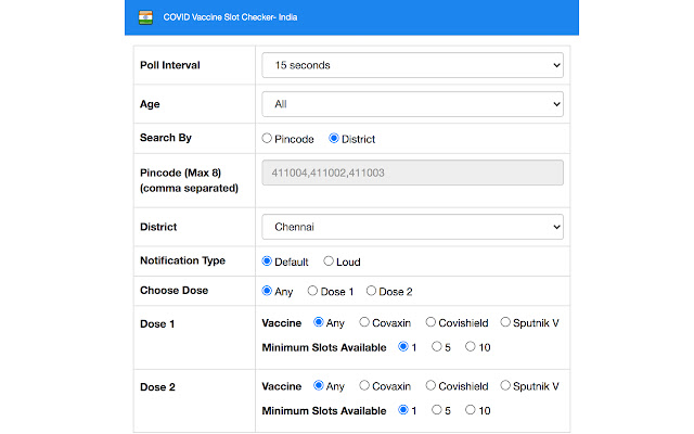 Update 1.21: Added filter for free/paid Added option for min age of 40 yrs UI refresh only updates the 'Availability' panel Update 1.20: Show/Hide the filters section Update 1.19: Option to poll every 15 seconds Filter by vaccine dose, type & minimum slots available Update 1.18: Option to search by district Update 1.17: Option to poll every 30 seconds Option to check all age groups Added loud notification