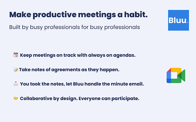 The Bluu Chrome Extension will allow you to manage the Bluu functionality to make awesome meetings a habit.