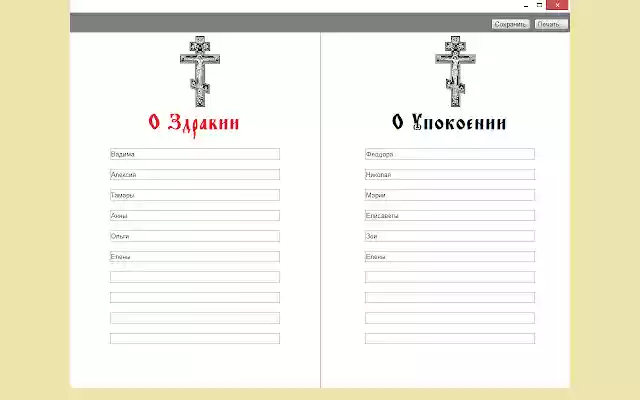 The application allows you to create, store and print the note to an Orthodox church, "for health" and "for repose".