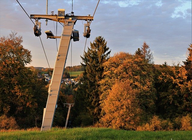 cable car support, reinforced concrete, mast, cantilevers, ropes, pulleys, forest autumn colors, sky, blue, clouds, trees, slope, Free photos,Free picture Cable Car Support Reinforced - integrated with the OffiDocs web apps