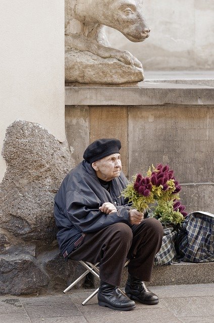 woman, old, age, person, hat, poor, seated, chair, street, corner, building, historical, sale, flowers, sculpture, lion, urban, city, tourism, Free photos,Free picture Woman Old Age - integrated with the OffiDocs web apps