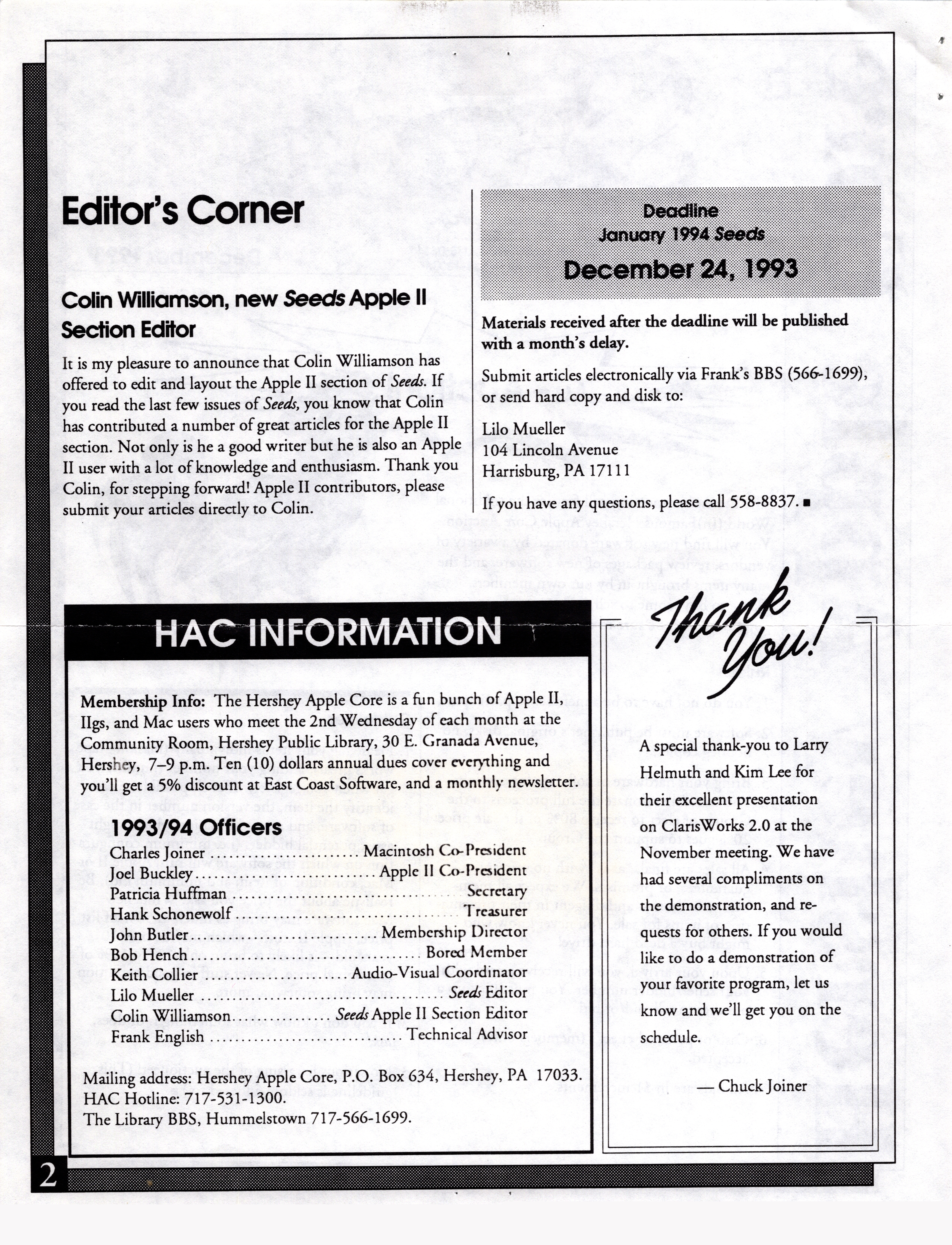 December 1993 issue of the Hershey Apple Core SEEDS newsletter. TheHershey Apple Core (or HAC) is an Apple Computer user group in Hershey,