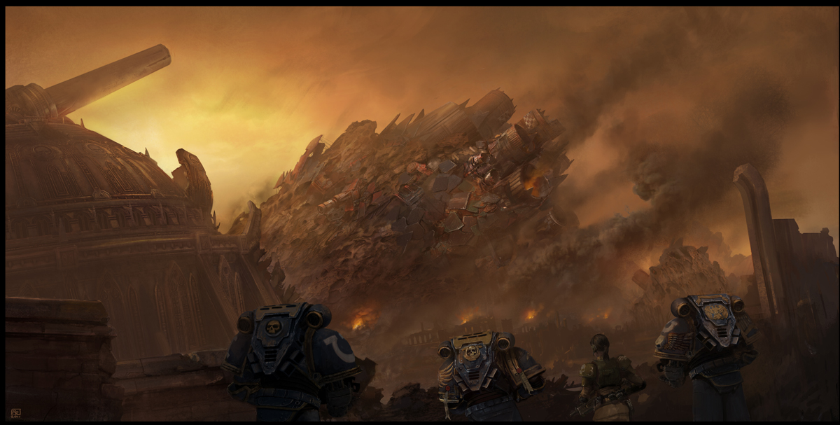 Concept art of a crashed Ork Rok in Warhammer 40k.