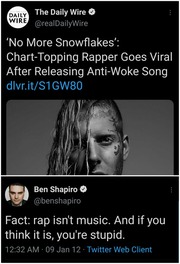 Ben Shapiro has been famous for saying that Rap Music isn't real Music, but he still praised Tom MacDonald for releasing "anti-woke" song. This potentially leads me to thinking that the reason he think Rap Music isn't real Music is because most rappers are black, and that he is racist.Free picture Ben Shapiro is racially motivated about rap integrated with the OffiDocs web apps