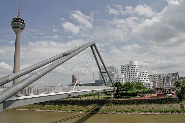 düsseldorf, state capital, port, gehry buildings, frank gehry, media harbour, bridge, rhine, skyline, note, north rhine westphalia, water, river, suspension bridge, city, Free photos,Free picture Düsseldorf State Capital Port - integrated with the OffiDocs web apps