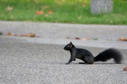 Instagram alt text: Photo of a black squirrel about to cross a suburban street.