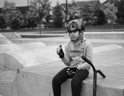 Instagram alt text: A boy is seated at the side of a skatepark, with his scooter by his side. He is listening to music from an iPod Shuffle in his hands.
