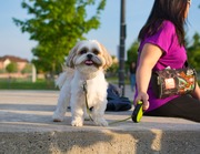 Instagram alt text: A Shih Tzu dog is looking at the camera with a smile on its face. It is standing on a concrete block at a skatepark on a summer evening.