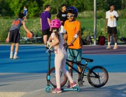 Instagram alt text: Photo of a boy and a girl smiling at each other in the middle of a skatepark. The girl has a scooter while the boy has a bike.