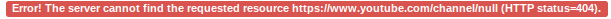 Error! The server cannot find the requested resource https://www.youtube.com/channel/null (HTTP status=404).