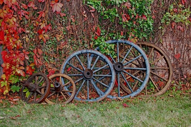 wheel, wooden wheel, autumn, nature, leaves, blue, spokes, wagon wheel, old, historically, nostalgic, agriculture, transport, grass, fall leaves, background, round, Free photos, Free Images.Free download template Wheel Wooden Autumn integrated with the OffiDocs web apps