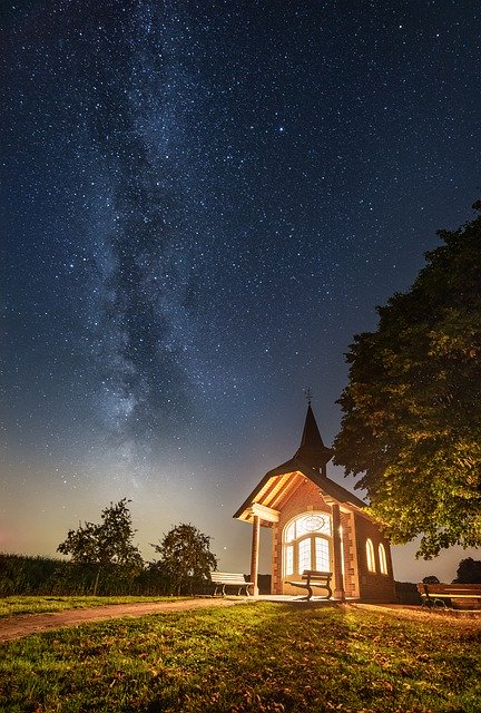 chapel, night, church, faith, architecture, religion, dark, sky, illuminated, landscape, light, christian, nature, believe, star, milky way, Free photos,Free picture Chapel Night Church - integrated with the OffiDocs web apps