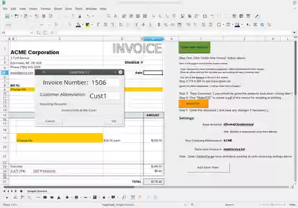 Push the green button: Fills in next invoice number automatically ( you can enter a new starting point ) Fills in date Generates a filename similar to: Invoice1234-ACME-Cust.