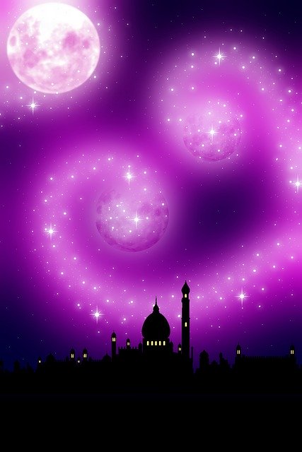 a thousand and one nights, sherazade, fairy tales, orient, fantasy, cover, magic, fairytale, mythical, strange world, world, space, milky way, moon, night, fantastic, silhouette, city, fairy moon, beautiful, romantic, playful, dreamy, different world, Free illustrations, Free Images.Free download template A Thousand And One Nights integrated with the OffiDocs web apps