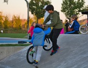 Instagram alt text: A boy in a green hoodie is helping a boy in a blue jacket pull his bike up the side of a skatepark after he fell over.